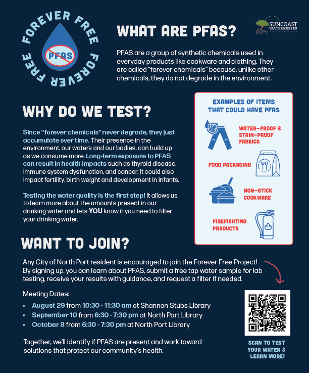 This month, Suncoast Waterkeeper launched Forever Free, a community initiative designed to raise awareness about PFAS in the city of North Port and provide free water testing to residents. The goal of the program is to monitor city waters for the forever chemicals and to share the results and solutions with the community.
