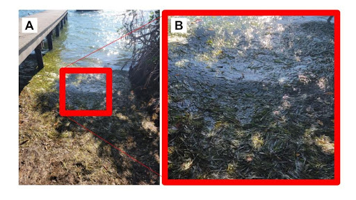 Photo A on the left shows the kayak launch at Longboat Key Bayfront Park, with the red box delineating our sampling area. Photo B on the right zooms into our sampling area, which is completely covered in surf zone wrack. Peyton took this photo on June 17, 2025, and the enterococci result was 108 #/100 mL, which is “poor” based on the Safe to Swim criteria : 0-35 is good; 36-70 is moderate, 71 and up is poor, but would be within Florida’s Class III water quality standards for recreational waterbodies. If the results of the California study hold here, then we can assume that the water closer to shore had 10 times the concentration (1,080 #/100 mL) as the area where we pulled the sample.