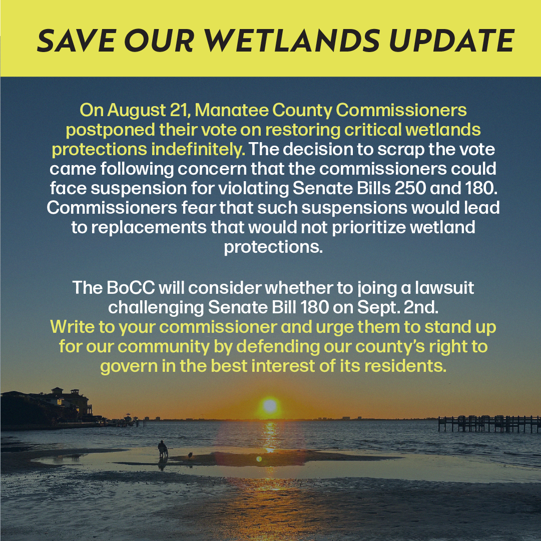 On August 21, the Manatee County Board of Commissioners (BoCC) was scheduled to vote on restoring the county’s 50-foot wetland buffer requirement. The Commission had initially planned to address the issue in May but delayed its action after receiving letters from state agencies warning that such a move would violate two new state laws, Senate Bills 250 and 180.