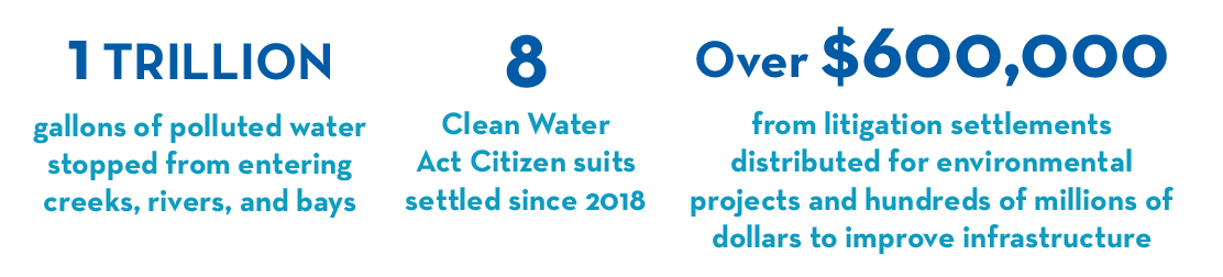 Since 2019, we have settled eight Clean Water Act Citizen suits. Five took action against municipalities illegally spilling over 1 trillion gallons of sewage, and three aimed to stop industrial facilities from illegally discharging heavy metal-laden stormwater. Combined, the suits contributed more than $600,000 for environmental projects aimed at enhancing local waters in Sarasota and Tampa Bays, as well as hundreds of millions of dollars of investments by Sarasota and the City of Bradenton to improve infrastructure. We all win when there is much less nitrogen pollution to fuel Red Tide, and there is an observable increase in seagrass meadows.